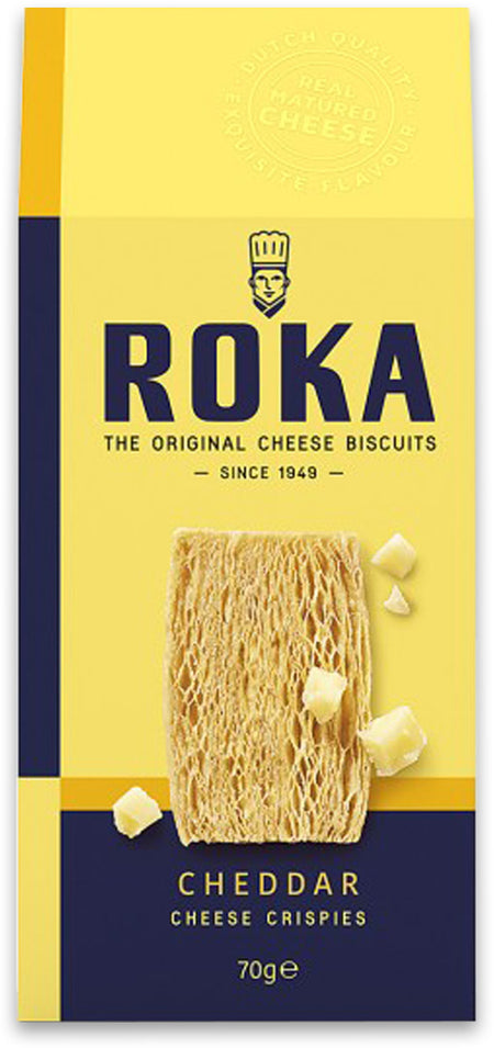 The company Roka was founded in 1949 in Delft (the Netherlands) by Jo Roodenrijs. The name Roka comes from Jo’s family name, Roodenrijs, and Kastabletten, which means cheese crispies. Roka biscuits are sold in very attractive packaging that is inspired by the original tins from 1949 and the art of the famous Dutch painter Piet Mondriaan (1872–1944). Some people even think of the Dutch tulip fields when they see our yellow and blue boxes with the vivid colours. They all know that Roka cheese snacks have an excellent unique flavour and texture. The unique taste comes from the high percentage of real matured cheese that is used. The texture is really unique because every single biscuit is made from refined puff pastry, consisting of 90 layers (45 layers of dough and 45 layers of cheese). Our crispies are still baked according to the original recipe created in 1949.